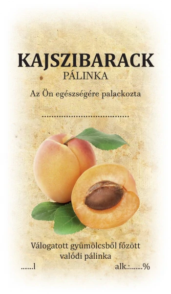 Samolepka na fľašu KAJSZIBARACK pálinka (Marhuľovica) je ideálnym spôsobom, ako označiť vaše domácí marhuľové destiláty s eleganciou a profesionalitou. Tieto etikety sú navrhnuté tak, aby poskytli vašim výrobkom dokonalý vzhľad, pričom zachovávajú všetky dôležité informácie ako ročník a percento alkoholu. Ak vyrábate marhuľovicu a hľadáte kvalitnú etiketu, ktorá skvele doplní vašu fľašu, táto samolepka je skvelou voľbou.
