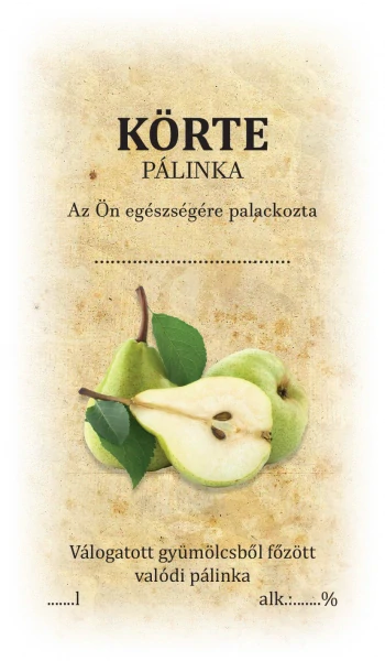 Profesionalita a atraktívny vzhľad: Etiketa KÖRTE pálinka (Hruškovica) dodá vašim fľašiam profesionálny vzhľad, ktorý zaujme každého. S elegantným dizajnom a čitateľnými informáciami bude vaša domáca hruškovica vyzerať ako výrobok najvyššej kvality.